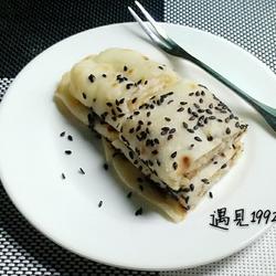 3.Put an appropriate amount of oil into the pan, pour the batter into the pan, sprinkle in an appropriate amount of black sesame seeds and fry them When both sides are lightly browned and the dough is puffed up, serve it on the pan.