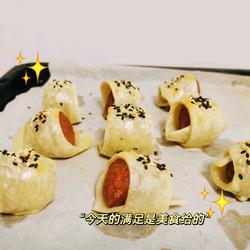 4. Cut the sausage into pieces and roll it up on the fan-shaped hand cake