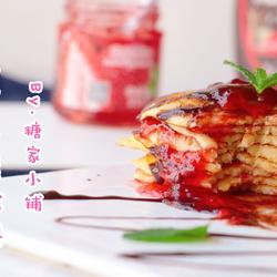 5.Put a layer of waffles and a layer of strawberry jam.Decorate with chocolate drizzle on top.