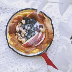 3. After the oven is preheated, take out the cast iron pan and pour the batter into the cast iron pan.! [The 16cm cast iron pot I used can be replaced with a baking bowl or baking pan of about 16cm.This is for one person.For double the amount for two people, you can replace it with a 20cm baking pan, etc.! The height of the baking pan and baking bowl is about 5cm for good effect]