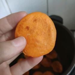 6. Use a spoon to scoop out the pancakes.Do not put any oil in the rice cooker.Put the pancakes in the rice cooker and turn them over repeatedly to prevent them from sticking to the pan.They are almost ready to be cooked