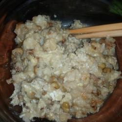 1. Boil the rice and mung beans.When cool, add the eggs and mix well.(Add seasonings to suit your own taste) Put oil in the pot, pour in the mixed ingredients when the oil is hot, and it is ready to be formed