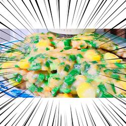 2. Stir the corn, leeks and pork evenly, add four spoons of flour and salt, and stir evenly.