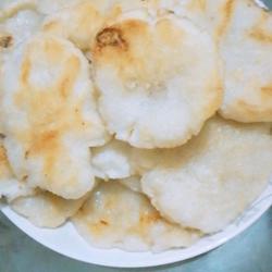 3. Heat the oil and turn off the heat.Take a little bit of the noodles at a time and shape them into small pancakes.The glutinous rice noodles are very crispy., be very careful