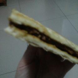 5.Place the meat filling on the dough, cover it with another piece of dough, press it well and put it into the electric baking pan until both sides are golden