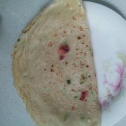 2. Beat the eggs, add salt, green onions, red dots of tomatoes, and bake pancakes