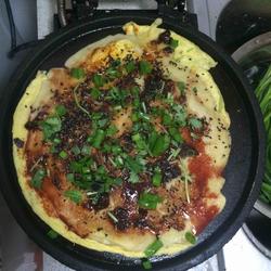 2. After turning it over, apply fried sauce, spicy sauce and bean curd juice , sprinkle with black sesame seeds, chopped green onion, and coriander