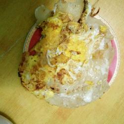 4.Pour the noodles into the pot, spread the flour evenly, when it is almost cooked, beat the eggs on the cake and fry until cooked.