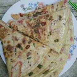 1.Put the eggs, flour and chopped green onion , diced sausage, pepper rings, salt, chicken essence, cumin, etc.Mix all the ingredients into batter and pour it into the pan