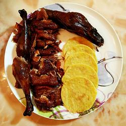 5. When the cake is ready, use the mold to cut out a round shape and put the heated duck on the plate.Cumin cakes are very fragrant