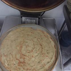 7.Put it into the electric cake pan and turn it five times to brush with oil
