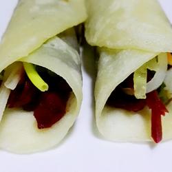 18.Take a piece of spring pancake skin and apply a layer of sauce