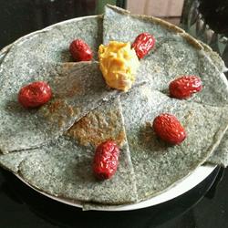 3. Cut the pancakes and put them on a plate, put the peeled egg yolks on them, and put the dates on them.