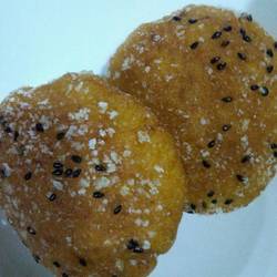 3.Take 60 grams of dough and form into a small ball.Roll the small balls in black sesame seeds and bread crumbs, then press them into cakes.