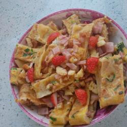 3.Branded.Brush the electric pan clean and control the water, heat it, brush it with a layer of oil, put the batter into the pan with a spoon, spread it evenly quickly, cover it and simmer for a while.When the batter is formed, turn it over and add the prepared egg liquid with a brush.Apply evenly, then flip over and bake for a while! Add fried dough sticks and diced ham to match!