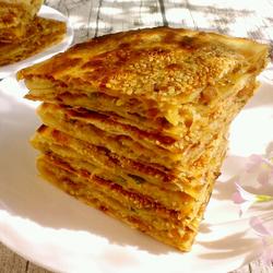 14.After twenty minutes, grab a handful of sesame seeds and press them on top.Use your hands to stretch and gently press from the middle to all sides to form a pancake shape