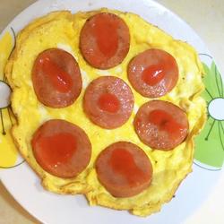 2. Beat the eggs and put them into the pot.Then spread the freshly fried ham on top of the omelette and fry it over slow heat until it is medium-cooked.No need to stir-fry