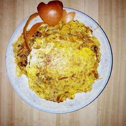 6.After one side is fried, put a little oil on the pan, break the eggs, stir, and spread on the potato cakes flip the coated side to the bottom, fry until cooked