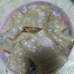 3. Spread the fried filling evenly on the cake, roll it up, cut it into small pieces with a knife, and you can eat it.(Be sure to eat it while it’s hot)
