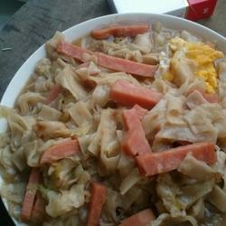 2.Pour in the oil, add chopped green onion, stir-fry the ham for a few times, add water and boil, and add the cake