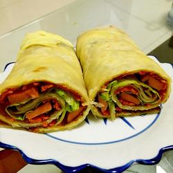 13.Put in shredded carrots, lettuce, green onions and sausage.Then roll it up, OK!