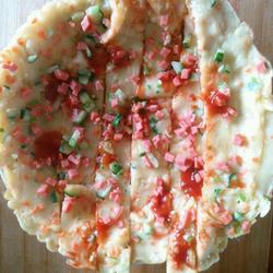 6. When the batter is almost cooked, sprinkle with chopped green onion and ham cubes, then sprinkle with a little tomato sauce,
