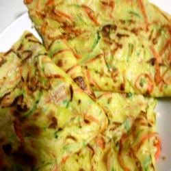 1.Grate zucchini and carrot into shreds and fry the carrot until soft.Put eggs and salt together