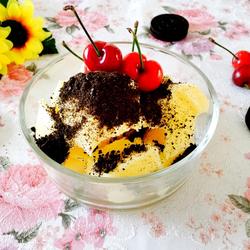 6. Bring the ice cream indoors for two minutes and scoop it out with a spoon.Crumble Oreo cookies, sprinkle on top, and decorate with cherries.