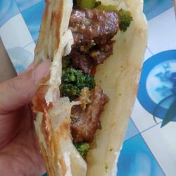 6. After the cakes are cooked, stir-fry the mutton.I add the marinated meat and vegetables together.Stir-fry until there is no soup in the pot, then add cumin powder and turn off the heat.Place the blanched broccoli on the bottom of the plate and the fried lamb on top.