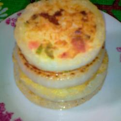 7. Then use a spoon to put a spoonful of rice and potato egg paste into the onion ring, and use a small Fry until set and then flip the other side.1