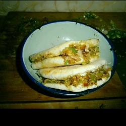 12.Cut the cake from the middle.Don't cut through.Put the meat in.Pour some soup.