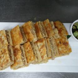 2.Spread the meat filling evenly on the rectangular cake surface! Remember not to touch the edges of the meat filling!