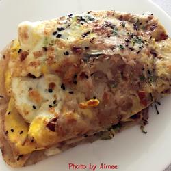 4.Pour a spoonful of whole wheat batter into the pan, spread the pancake, and crack an egg.