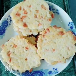 5.Put an appropriate amount of oil in the pot, put an appropriate amount of rice into the pot, press it into a cake shape with a spatula, and fry until both sides are golden.