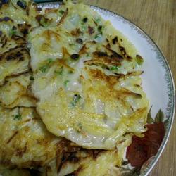 1.Grate potatoes into shreds and mix with flour, water, pepper, salt, chopped green onion and chicken powder into a paste.