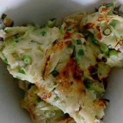 1.Grate the pumpkin into shreds, mince the green onion, add salt, egg and flour, and mix into a paste.
