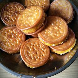 3.The biscuits were also bought in the supermarket.Thinly slice the biscuit, then pinch a small piece, roll it into a round shape and press it on the dry biscuit, roll it with sesame seeds, and finally put it in the pan to fry.Pay attention to frying on low heat the whole time.Fry until golden and it is ready to serve