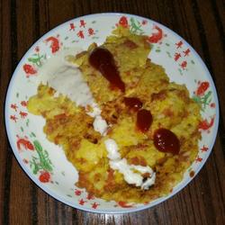 4. Fry in a pan and top with tomato sauce and salad dressing.