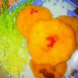 9. Pour the cold mashed potatoes into the fried minced meat and knead into cakes.Set aside.