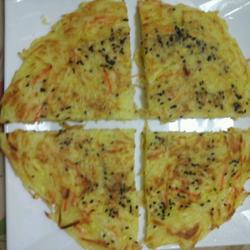 2.Stir evenly, add a little oil to the pan, add the mixed ingredients, smooth, you can add some sesame seeds, turn over when cooked