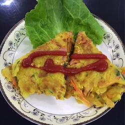 3.Pour in the mixed noodles together In the pot, flatten it with a spatula and fry until golden brown, then flip to the other side.Then start the pot!