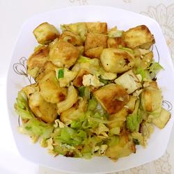 4. Heat the oil in the wok, and when it is about 70 to 80% hot, pour in the egg liquid and fry the cooked eggs.Dish out and set aside.Heat oil, add garlic slices, Sichuan peppercorns, then add cabbage slices and continue to stir-fry.When the cabbage is slightly soft, add the diced pancakes and stir-fry until the pancakes are hot.