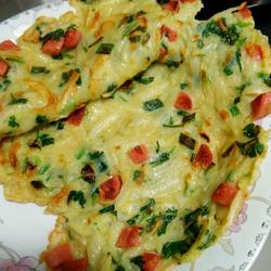 2.Grate the potatoes, chop the coriander, and cut the ham into small dices.Beat the eggs inside