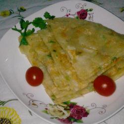 9. Add salt and pepper.As shown in the picture.Then cover with dumpling wrapper.Repeat 5 times.That is, 5 dumpling skins make one cake.