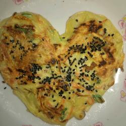 4. After heating the non-stick pan, add an appropriate amount of oil, put the prepared double silk paste into the pan and adjust it to your liking shape, sprinkle with black sesame seeds and fry on both sides