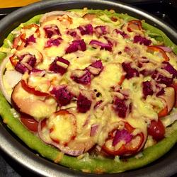 2.I use spinach juice to mix the dough.The dough is ready.Roll it out into a dough and place it in a pizza pan.Use a small Poke some small holes on it with a fork for better ventilation