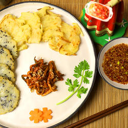 1.Put vinegar, soy sauce, water, sugar, sesame seeds, minced green onions, and chili noodles into a bowl to make a dipping sauce