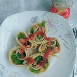 It’s better to spread the egg pancakes thinner, and shred the green pepper and ham more finely.