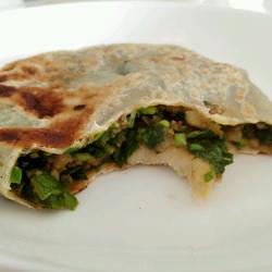 5. Add more thin noodles, roll it into a thin skin, and wrap a lot of leeks.Heat the pan until a small amount of oil is hot and add the patties.