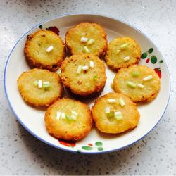 3.Finally, use an iron spoon dipped in water to press the potato balls into a cake shape.Put more oil in it, put them in one by one and fry until they are slightly brown and take them out.Arrange on plate and sprinkle with chopped green onion.